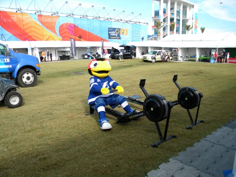 The official mascot of the 2017 World Rowing Championships giving the erg a try.